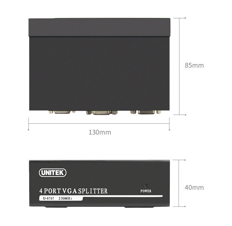 Bộ chia VGA 1 ra 2 Unitek U-8706 - Hàng Chính Hãng Đầu vào: 1 cổng VGA Đầu ra:2 cổng VGA Kháng đầu vào: 75Ω Truyền Khoảng cách lý tưởng : 25m Độ phân giải: