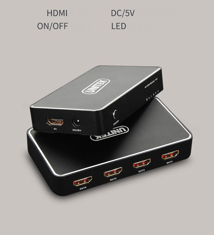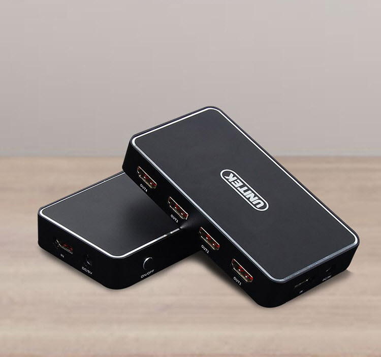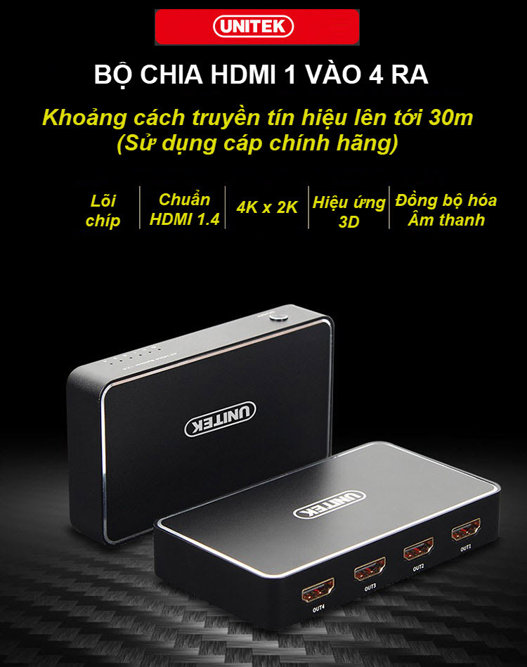 Unitek V109A - Bộ Chia HDMI 1 ra 4 Độ Phân Giải 4K HD Hỗ Trợ 3D Khoảng Cách Truyền Lên Tới 30m Kèm Nguồn AnZ Chuẩn HDM 1.4 Hỗ trợ độ phân giải lên tới 4K Khoảng cách truyền lên tới 30m (đối với cáp chính hãng) Hỗ trợ các thiết bị đầu vào: Notebook, Set-top Box, TV Box, DVD Các thiết bị đầu ra: TV, Máy chiếu, Màn hình máy tính Kèm nguồn 5v 1A