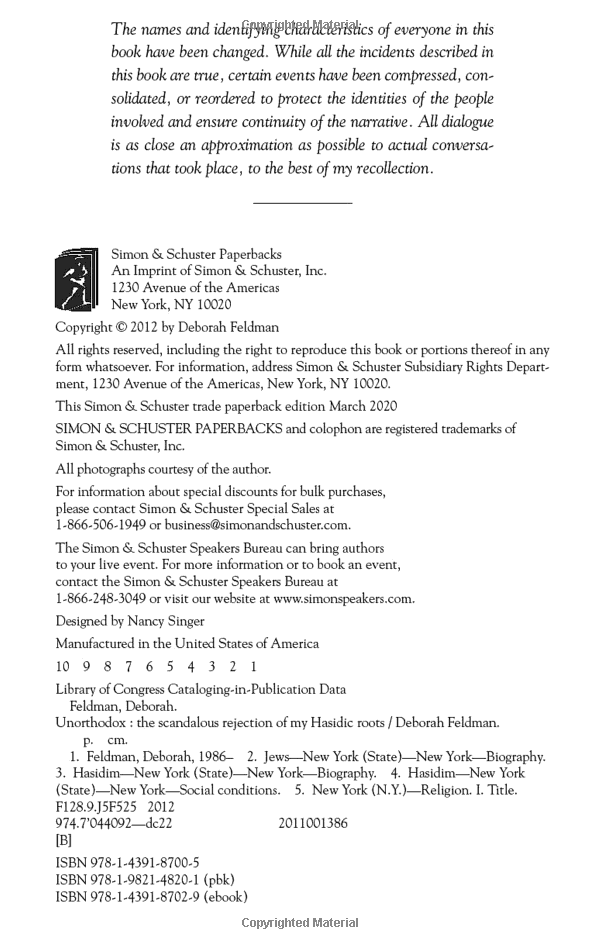 As a member of the strictly religious Satmar sect of Hasidic Judaism, Deborah Feldman grew up under a code of relentlessly enforced customs governing everything from what she could wear and to whom she could speak to what she was allowed to read. Yet in spite of her repressive upbringing, Deborah grew into an independent-minded young woman whose stolen moments reading about the empowered literary characters of Jane Austen and Louisa May Alcott helped her to imagine an alternative way of life among the skyscrapers of Manhattan. Trapped as a teenager in a sexually and emotionally dysfunctional marriage to a man she barely knew, the tension between Deborah’s desires and her responsibilities as a good Satmar girl grew more explosive until she gave birth at nineteen and realized that, regardless of the obstacles, she would have to forge a path—for herself and her son—to happiness and freedom.