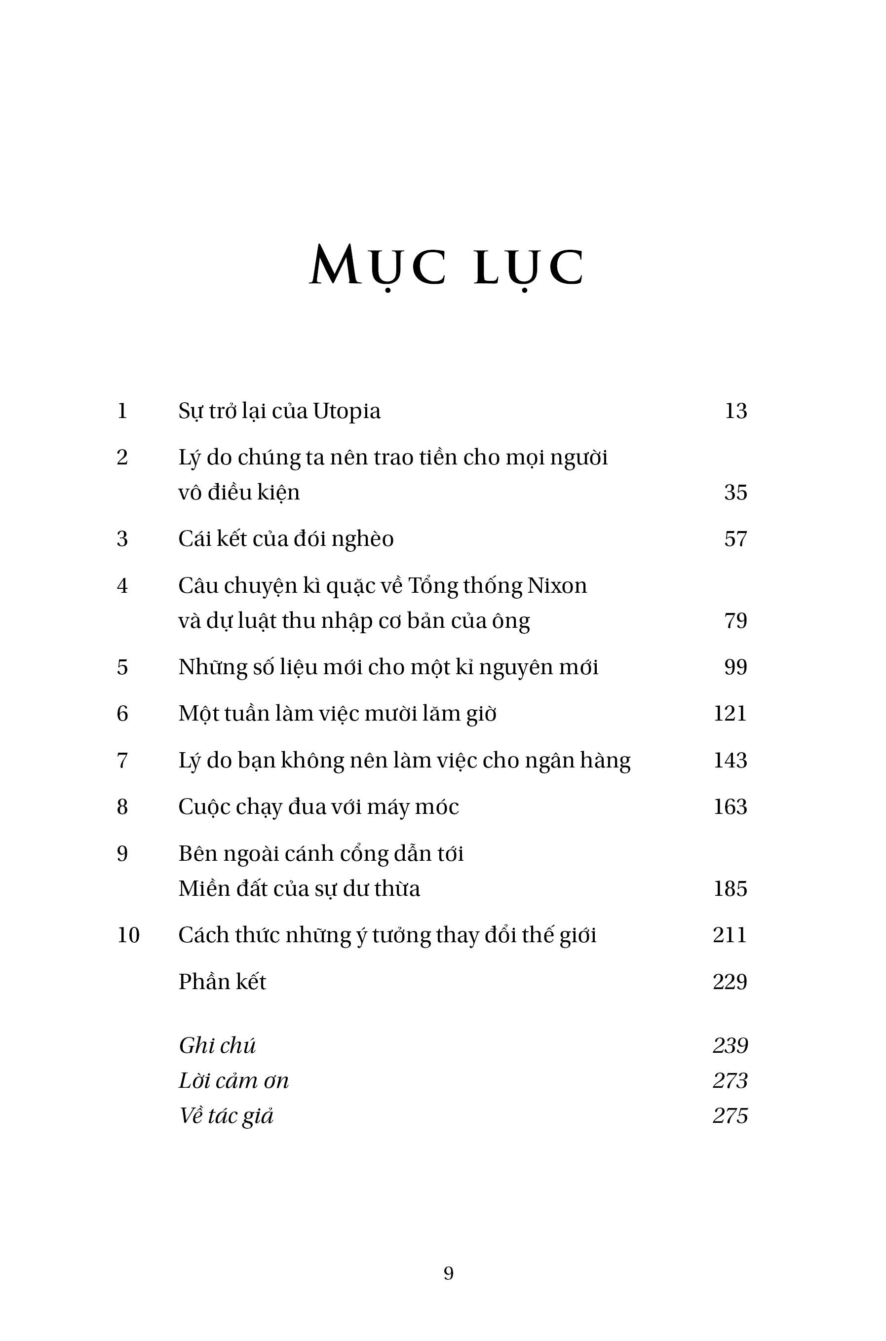 Và ở đây, Bregman đã đề xướng ra ba ý tưởng “kì lạ”: 1. Mỗi người dân đều có thu nhập cơ bản để đảm bảo cuộc sống tối thiểu mà không cần điều kiện đi kèm. 2. Rút ngắn thời gian làm việc xuống còn 15 giờ mỗi tuần. 3. Mở cửa biên giới các nước để người dân có thể tự do đi lại bất cứ nơi nào họ muốn.