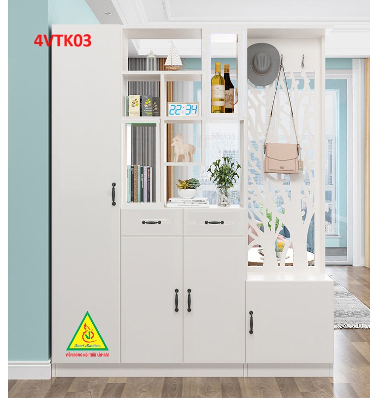 Vách ngăn còn có tủ giúp lưu trữ những vật dụng cá nhân của gia chủ , tận dụng được không gian sống tốt hơn. Sản phẩm lắp ráp dễ dàng di chuyển khi cần thiết.