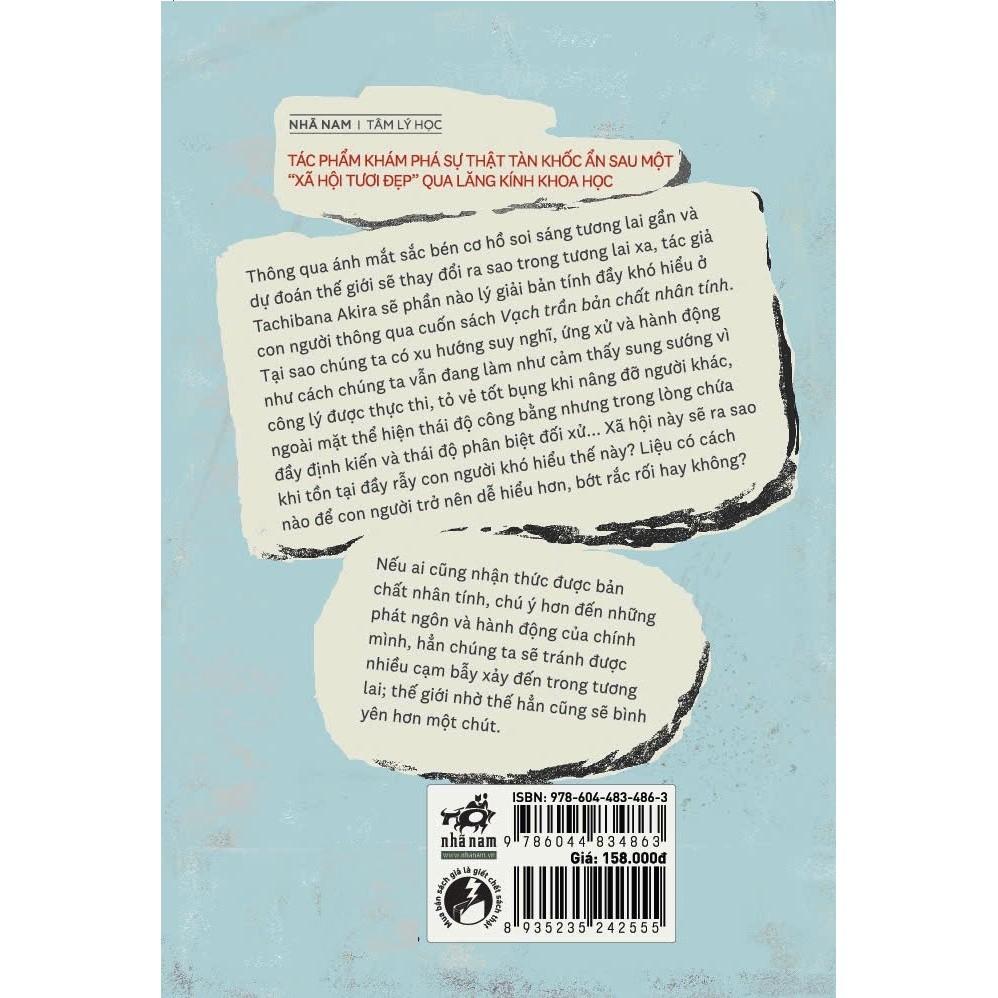 Mua tại TiktokGiới thiệu sách: Vạch Trần Bản Chất Nhân Tính - Ngu Dốt Và Vô Tri, Tin Cậy Và Phản Bội, Vị Kỷ Và Vị Tha, Phục Tùng Và… TÁC PHẨM KHÁM PHÁ SỰ THẬT TÀN KHỐC ẨN SAU MỘT “XÃ HỘI TƯƠI ĐẸP” QUA LĂNG KÍNH KHOA HỌC!!! Thông qua ánh mắt sắc bén cơ hồ soi sáng tương lai gần và dự đoán thế giới sẽ thay đổi ra sao trong tương lai xa, tác giả Tachibana Akira sẽ phần nào lý giải bản tính đầy khó hiểu ở con người thông qua cuốn sách Vạch trần bản chất nhân tinh. Tại sao chúng ta có xu hướng suy nghĩ, ứng xử và hành động như cách chúng ta vẫn đang làm như cảm thấy sung sướng vì công lý được thực thi, tỏ vẻ tốt bụng khi nâng đỡ người khác, ngoài mặt thể hiện thái độ công bằng nhưng trong lòng chứa đầy định kiến và thái độ phân biệt đối xử... Xã hội này sẽ ra sao khi tồn tại đầy rẫy con người khó hiểu thế này? Liệu có cách nào để con người trở nên dễ hiểu hơn, bớt rắc rối hay không? Nếu ai cũng nhận thức được bản chất nhân tính, chú ý hơn đến những phát ngôn và hành động của chính mình, hẳn chúng ta sẽ tránh được nhiều cạm bẫy xảy đến trong tương lai; thế giới nhờ thế hẳn cũng sẽ bình yên hơn một chút.
