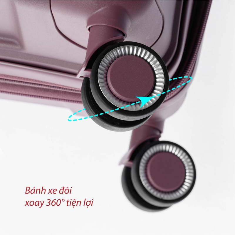 Vali gồm có 8 bánh xe bạc thép chia thành 4 đôi xoay 360 độ linh hoạt, chịu được lực nặng, giảm ồn tốt và đặc biệt bánh xe di chuyển nhẹ nhàng ở mọi địa hình.