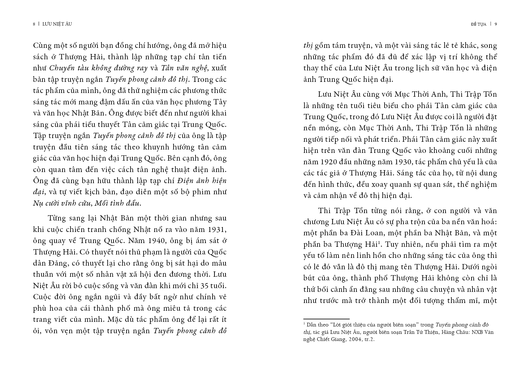 Tuyến phong cảnh đô thị là tuyển tập gồm tám truyện ngắn của Lưu Niệt Âu, được biết đến như sáng tác đầu tiên theo khuynh hướng tân cảm giác của văn học hiện đại Trung Quốc. Văn chương Lưu Niệt Âu có sự pha trộn của ba nền văn hoá, nhưng nếu phải tìm ra một yếu tố làm nên linh hồn cho tác phẩm của ông thì có lẽ chính là đô thị mang tên Thượng Hải. Dưới ngòi bút nhà văn, thành phố Thượng Hải đầu thế kỉ XX không còn chỉ là một thứ bối cảnh làm nền cho những câu chuyện tình yêu và nhân vật nam nữ mà đã trở thành một đối tượng thẩm mĩ, một thực thể độc lập, tràn đầy sức sống.