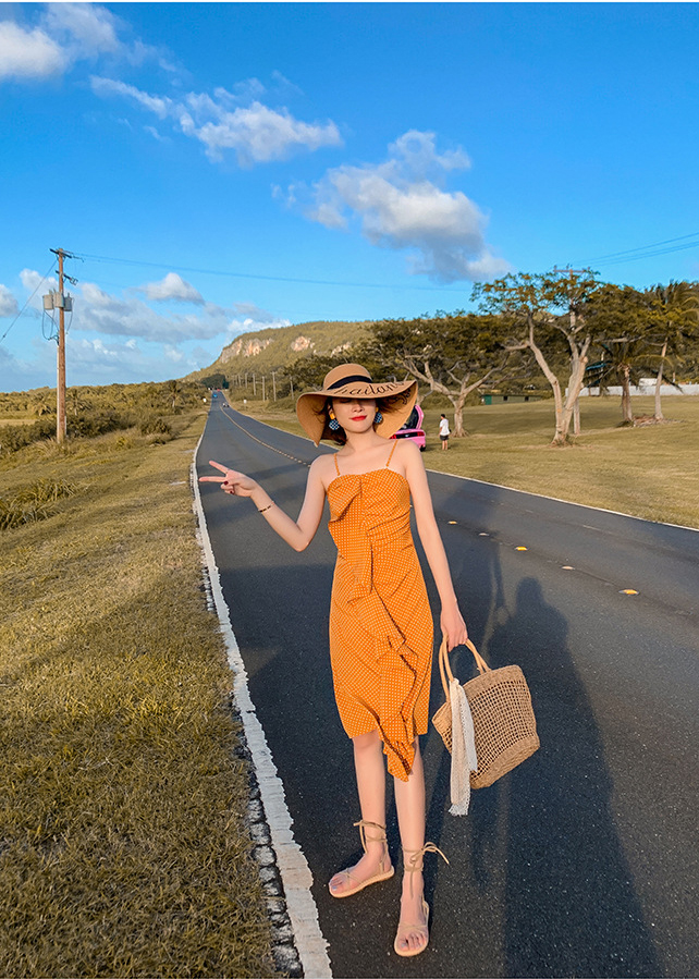 ✨Váy maxi 2 dây chấm bi vàng, bèo nhún cách điệu trước, tôn dáng, đầm voan đi biển cá tính, họa tiết chấm bi dễ mặc | MX053