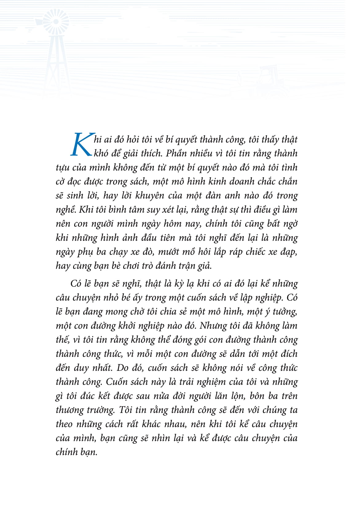 Có lẽ bạn sẽ nghĩ, thật là kỳ lạ khi có ai đó lại kể những câu chuyện nhỏ bé ấy trong một cuốn sách về lập nghiệp. Có lẽ bạn đang mong chờ tôi chia sẻ một mô hình, một ý tưởng, một con đường khởi nghiệp nào đó. Nhưng tôi đã không làm thế, vì tôi tin rằng không thể đóng gói con đường thành công thành công thức, vì mỗi một con đường sẽ dẫn tới một đích đến duy nhất. Do đó, cuốn sách sẽ không nói về công thức thành công. Cuốn sách này là trải nghiệm của tôi và những gì tôi đúc kết được sau nửa đời người lăn lộn, bôn ba trên thương trường. Tôi tin rằng thành công sẽ đến với chúng ta theo những cách rất khác nhau, nên khi tôi kể câu chuyện của mình, bạn cũng sẽ nhìn lại và kể được câu chuyện của chính bạn.