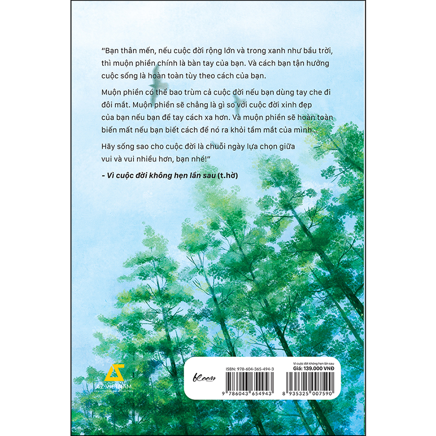 “Bạn thân mến, nếu cuộc đời rộng lớn và trong xanh như bầu trời, thì muộn phiền chính là bàn tay của bạn. Và cách bạn tận hưởng cuộc sống là hoàn toàn tùy theo cách của bạn. Muộn phiền có thể bao trùm cả cuộc đời nếu bạn dùng tay che đi đôi mắt. Muộn phiền sẽ chẳng là gì so với cuộc đời xinh đẹp của bạn nếu bạn để tay cách xa hơn. Và muộn phiền sẽ hoàn toàn biến mất nếu bạn biết cách để nó ra khỏi tầm mắt của mình… Hãy sống sao cho cuộc đời là chuỗi ngày lựa chọn giữa vui và vui nhiều hơn, bạn nhé!”