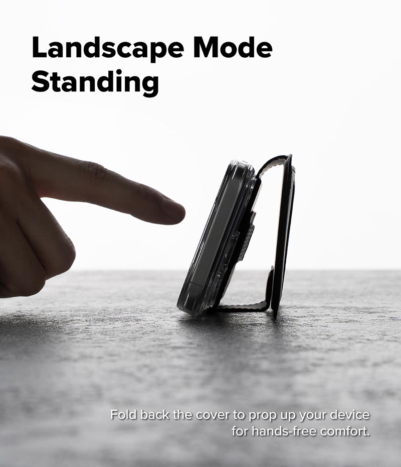 - Ringke Folio Grip Wallet Magnetic là sản phẩm tích hợp 2 tính năng trong một: ví đựng thẻ kiêm giá đỡ và cần được dùng chung với ốp lưng Magnetic dành riêng cho dòng máy iPhone 17 Pro Max.
