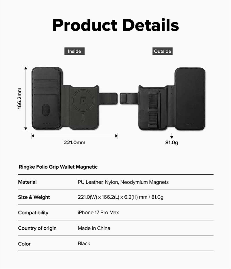 - Sản phẩm chỉ là ví nhằm mục đích đựng thẻ, không có khả năng chống sốc. THÔNG SỐ KỸ THUẬT Tên sản phẩm: Ringke Folio Grip Wallet Magnetic Chức năng: ví kiêm giá đỡ điện thoại, có hỗ trợ Magnetic Dòng máy tương thích: iPhone 17 Pro Max (Lưu ý: sản phẩm cần được sử dụng với ốp lưng Magnetic và ốp lưng KHÔNG kèm theo, bạn cần mua ốp lưng riêng) Màu sắc: BLACK Kích thước: 221.0 x 166.2 x 6.2 mm Trọng lượng: 81 gram Hình ảnh sản phẩm