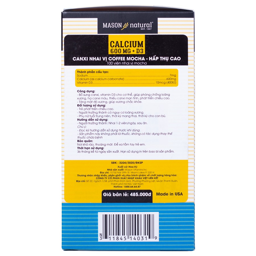 ✨Viên Uống Bổ Sung Canxi và Vitamin D3 Hỗ Trợ Xương Chắc Khỏe, Tăng Chiều Cao Mason Nature Calcium 600MG + D3 Hộp 100v