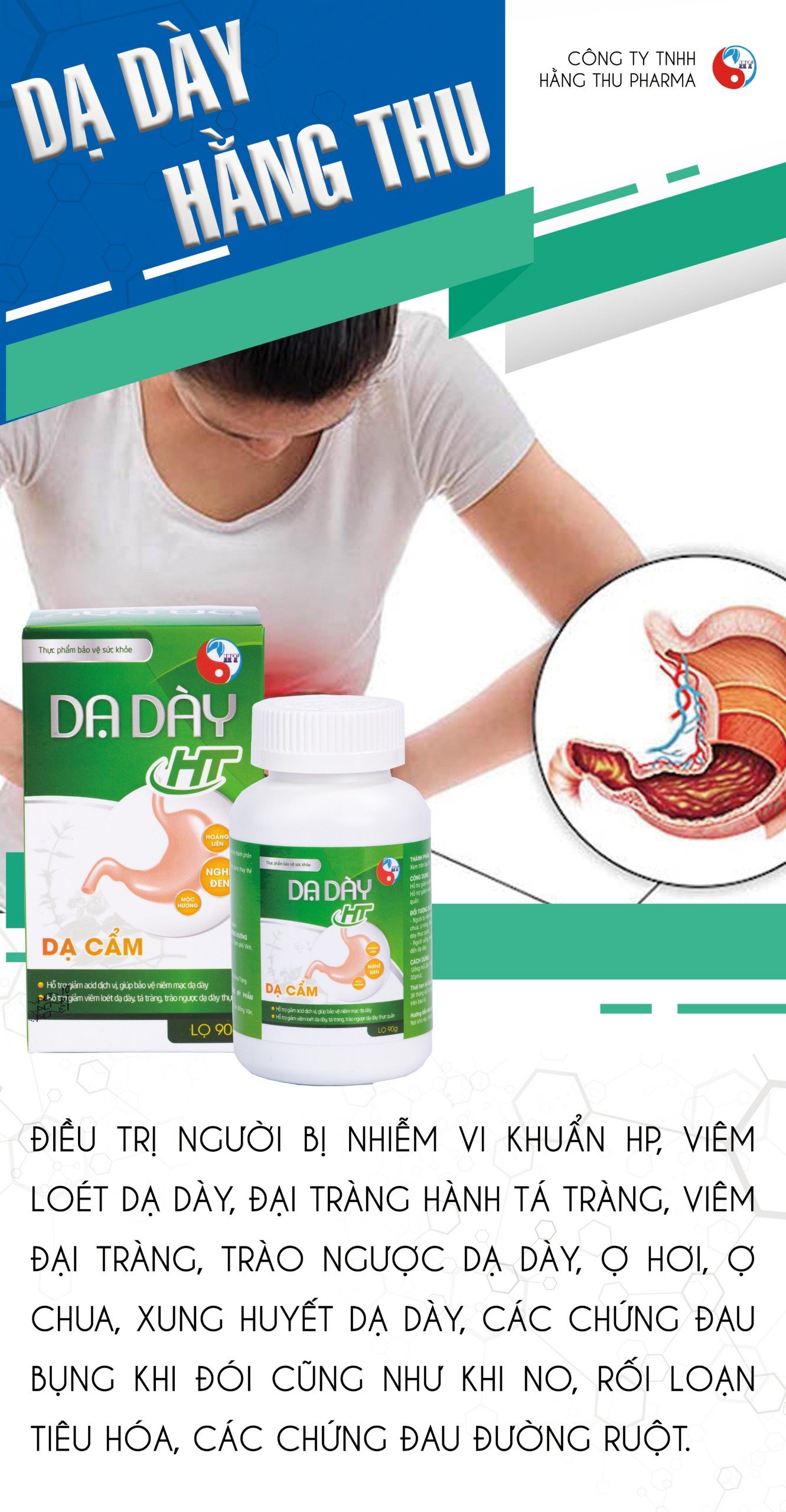 - Trần bì: Điều trị khó tiêu. Bồ công anh: Điều trị đau dạ dày, ăn uống không tiêu Cơ chế khác biệt Dạ Dày Hằng Thu chữa dứt điểm không tái lại Thứ 1. Kháng viêm: ức chế kháng viêm, diêt khuẩn HP sự phát triển vi khuẩn HP. Đào thải viêm loét ra ngoài bằng đường tiêu hoá. Thứ 2. Làm lành vết loét trong dạ dày Thứ 3: Phục hồi ngăn ngừa, thúc đâỷ quá trình tái tạo niêm mạc và HCl, Chống lại tác hại của axit. Đối tượng sử dụng Dạ Dày Hằng Thu Người gặp các vấn đề về dạ dày, đại tràng. Người uống nhiều rượu bia, thuốc tây gây hại đến dạ dày. Cách dùng: Uống mỗi lần 10-20 viên. Ngày uống 2 lần trước khi ăn 30 phút