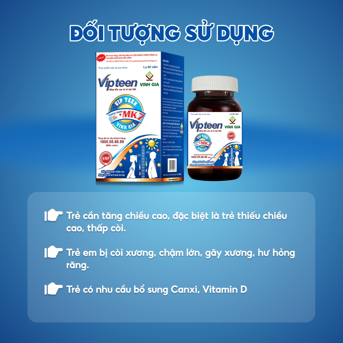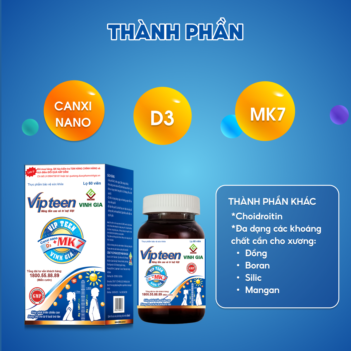 Mua tại TiktokVIÊN UỐNG HỖ TRỢ PHÁT TRIỂN CHIỀU CAO VIPTEEN VINH GIA BỔ SUNG CANXI, VITAMIN D3 GIÚP XƯƠNG CHẮC KHỎE, DÀNH CHO THANH THIẾU NIÊN VÀ TRẺ EM TỪ 9 TUỔI - LỌ 60 VIÊN