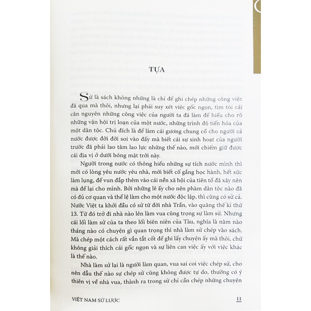 Việt Nam Sử Lược “Sử là sách không những là chỉ để ghi chép những công việc đã qua mà thôi, nhưng lại phải suy xét việc gốc ngọn, tìm tòi cái căn nguyên những công việc của người ta đã làm để hiểu cho rõ những vận hội trị loạn của một nước, những trình độ tiến hóa của một dân tộc. Chủ đích là để làm cái gương chung cổ cho người cả nước được đời đời soi vào đấy mà biết cái sự sinh hoạt của người trước đã phải lao tâm lao lực những thế nào, mới chiếm giữ được cái địa vị ở dưới bóng mặt trời này… … Nay nhân sự học ở nước ta đã thay đổi, chữ quốc ngữ đã phổ thông cả trong nước, chi bằng ta lấy tiếng nước nhà mà kể chuyện nước nhà, ta soạn ra bộ “Việt Nam sử lược”, xếp đặt theo thứ tự, chia ra từng thời đại, đặt thành chương, thành mục rõ ràng, để ai cũng có thể xem được sử, ai ai cũng có thể hiểu được chuyện, khiến cho sự học sử của người mì
