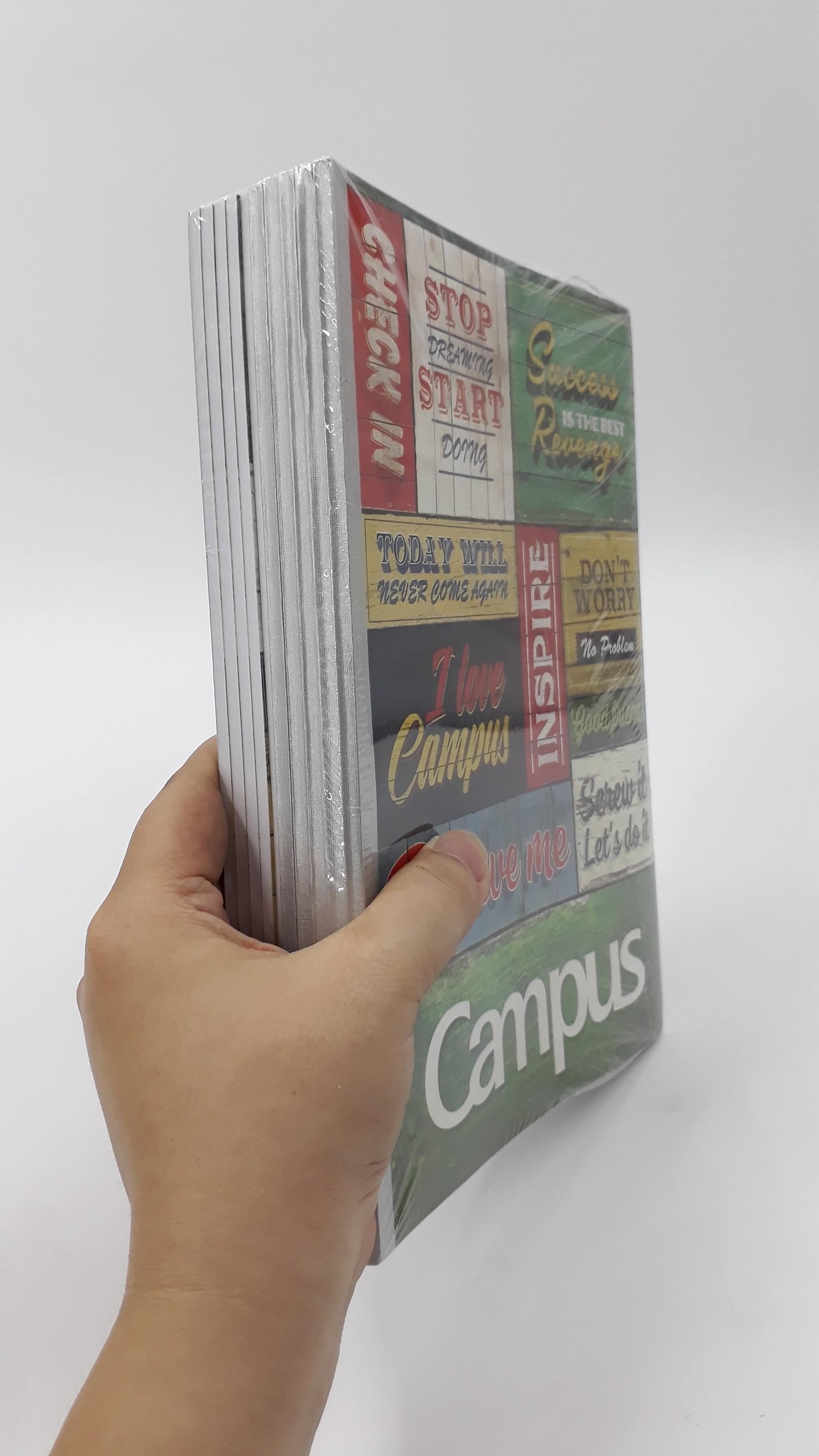Định lượng 70g/m2. Số trang 80, khổ B5. Lốc gồm 5 quyển tập Campus với các màu xanh dương, xanh lá, vàng hồng.