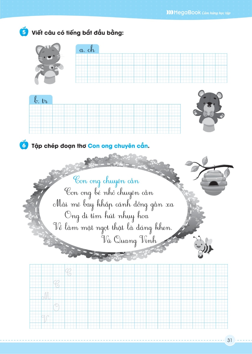 - Phần bài tập được chia theo từng chủ đề bám sát chương trình học của bộ GD & ĐT Mỗi bài ôn luyện theo chủ đề là các bài tập đa dạng với các hình ảnh minh họa sinh động tạo hứng thú học tập Cùng với đa dạng bài tập củng cố, các con điền, nối, ghép, gạch chân...và luyện chép chính tả: Chữ hoa, đoạn thơ, đoạn văn được trích dẫn.