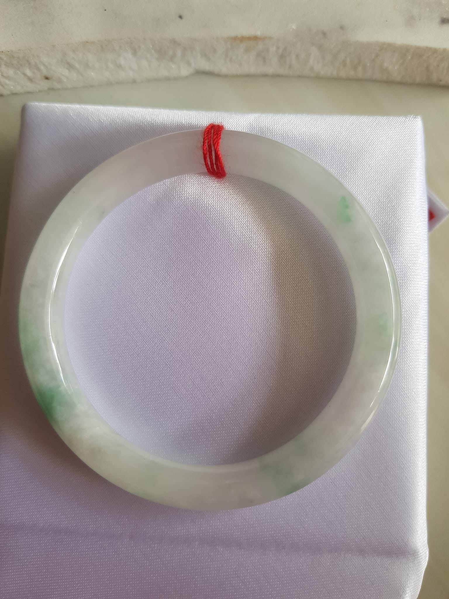 ✨Vòng đeo tay Nữ đá cẩm thạch tự nhiên T Lý Size 49mm x cọng 7mm Màu trắng sáng bóng xanh lý 3 chỗ đều quanh vòng rất đẹp Nữ cân Nặng 40kg-49kg đeo đẹp ạ