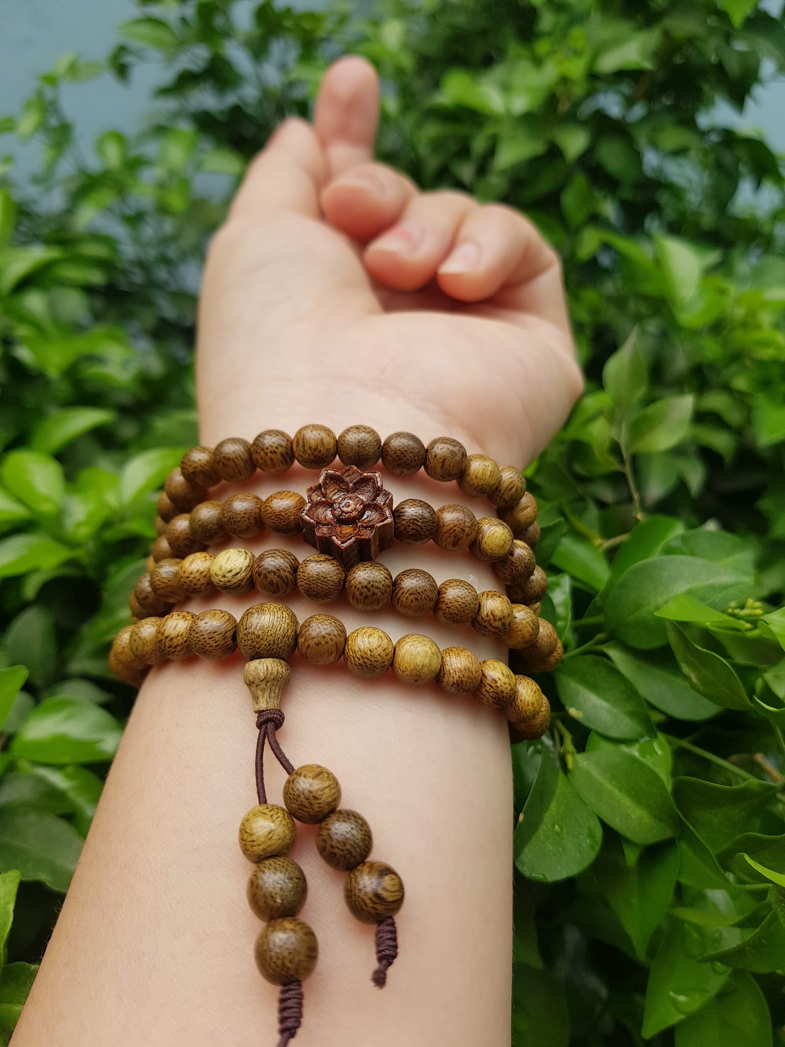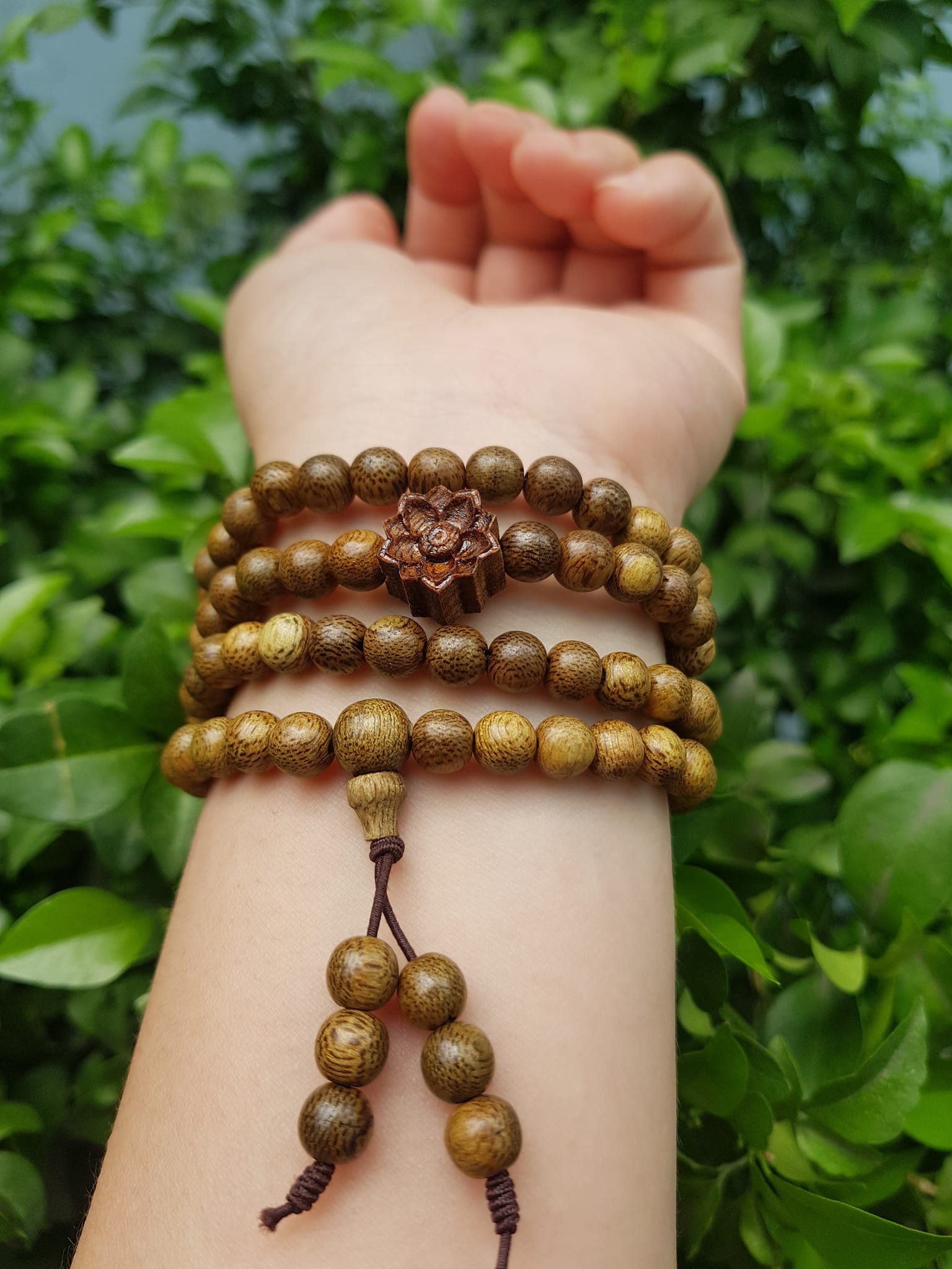 ✨Vòng đeo tay nữ gỗ trầm mix bông hoa sen kiểu quấn tay 4 vòng may mắn tài lộc Size hạt 6mm Màu vàng nâu vân sáng nhẹ đeo tay rất đẹp xinh mùi thơm nhẹ nhẹ ạ