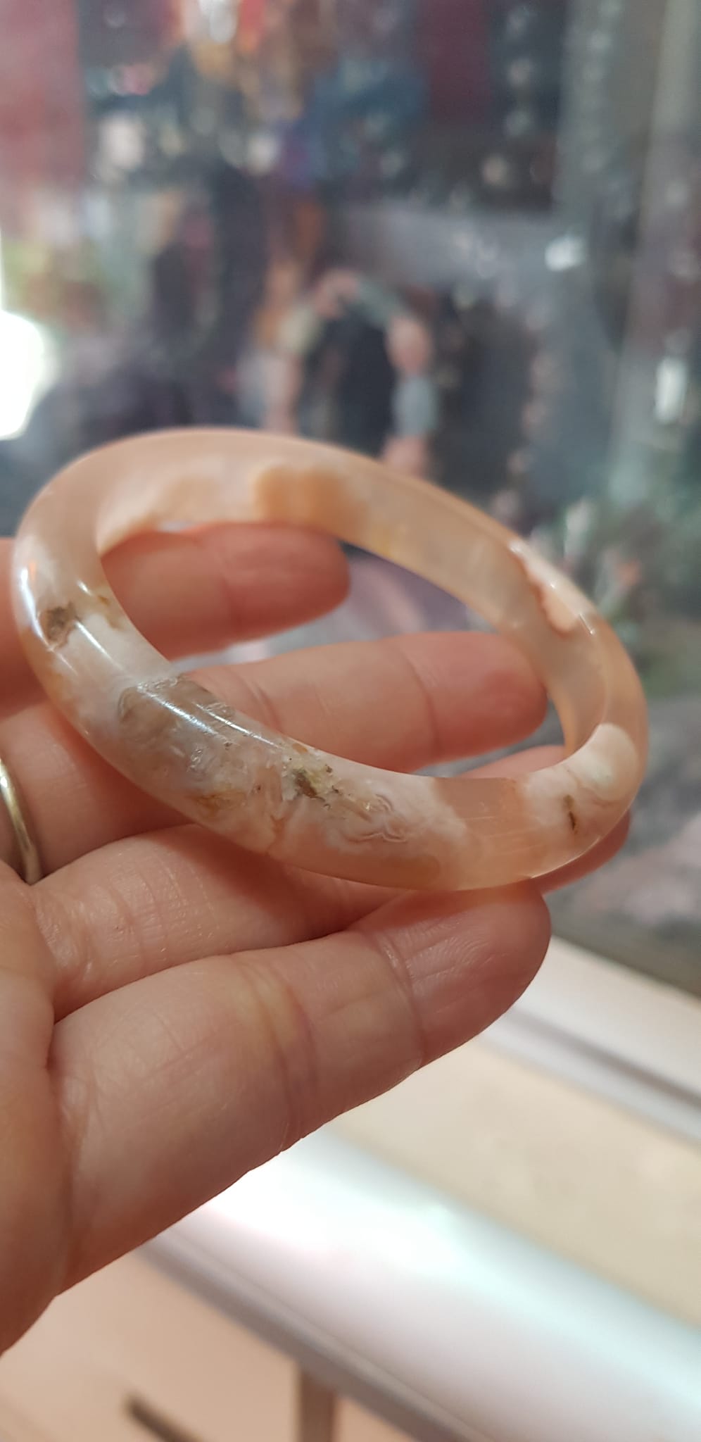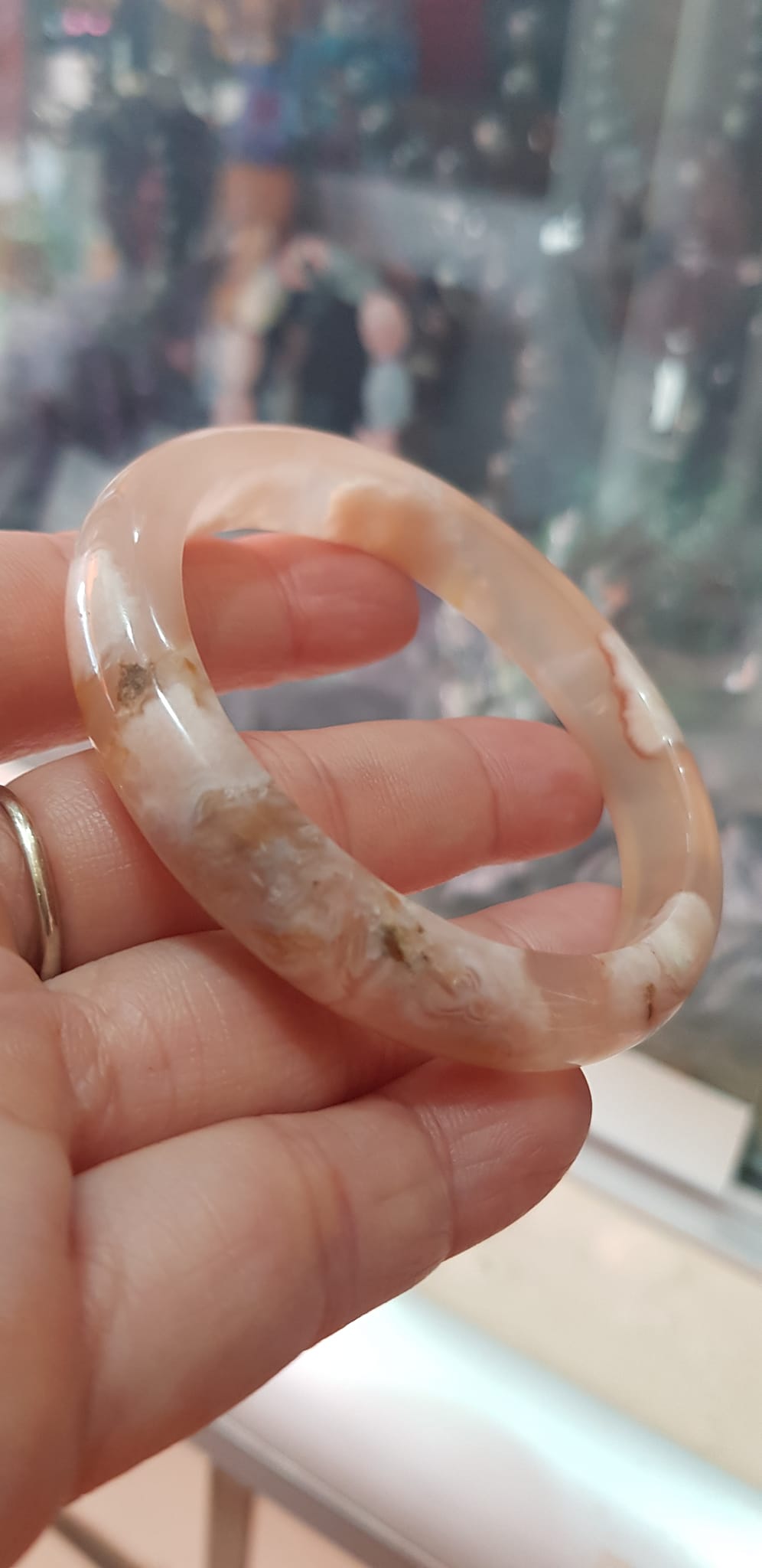 ✨Vòng tay Nữ Bản Hẹ Mới Đá Mã Não Bông Tuyết Hồng nhẹ trắng trong bóng quá đẹp luôn ạ Vòng Ni 53mm x Cao 11mm x dầy 7mm Nữ Cân nặng 52kg - 55kg đeo xinh tay đẹp lắm ạ