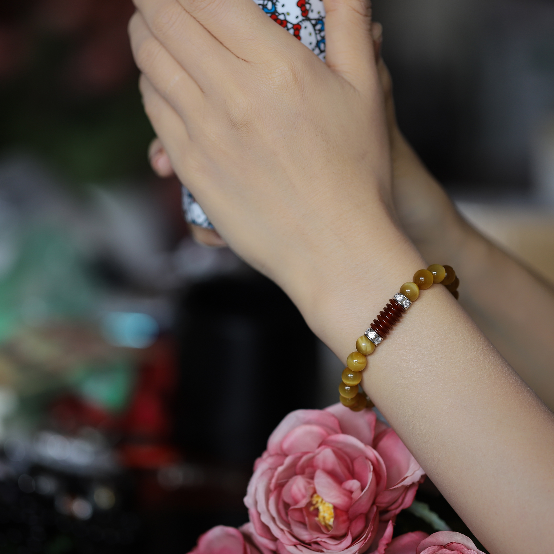 Vòng tay mân côi đá mắt hổ vàng tâm - Hợp Mệnh Kim & Thổ [ Ngọc Quý ]