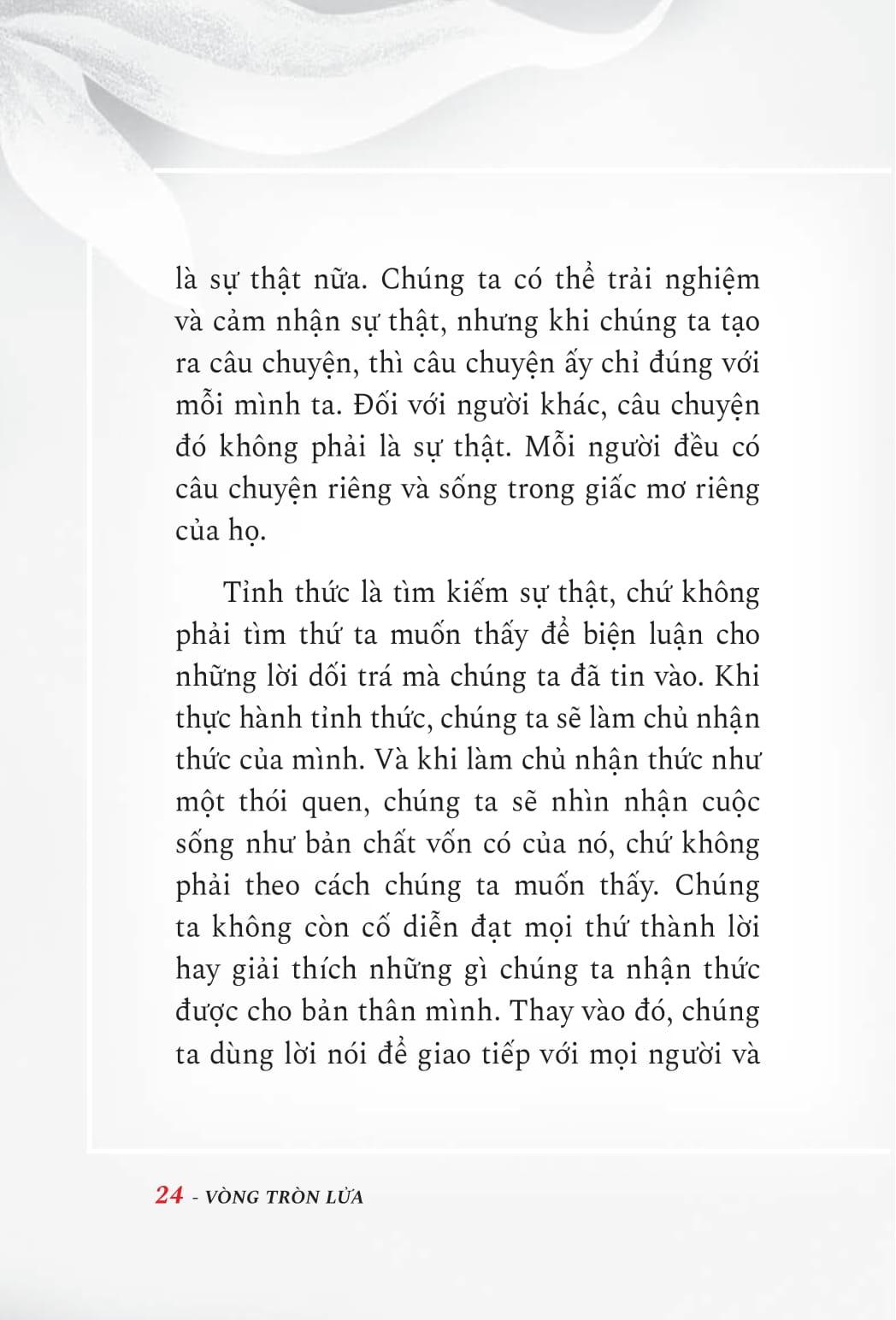 Trong Vòng tròn lửa, don Miguel Ruiz truyền cảm hứng cho chúng ta bước vào một mối quan hệ mới và đầy yêu thương với chính m.ình, với đồng loại và với tất cả tạo vật. Thông qua tuyển chọn những bài luận hay, những lời cầu nguyện và những bài thiền có hướng dẫn, Ruiz chuẩn bị tâm trí của chúng ta cho một cách nhìn mới về cuộc sống và mở rộng tâm hồn chúng ta để tìm đường trở lại đúng nghĩa sinh thành của chúng ta: thiên đường trên trái đất. Khi bắt đầu mỗi bài giảng và lớp học của m.ình, don Miguel mở đầu bằng một bài thiền hoặc lời cầu nguyện để truyền cảm hứng và khơi gợi khung tâm trí dễ tiếp thu, đồng thời củng cố các khái niệm đang được giới thiệu. Tương tự như vậy, độc giả có thể sử dụng cuốn sách này như một nguồn cảm hứng trong những lúc cần thiết hoặc như một nguồn động viên hàng ngày. Xuyên suốt The Circle of Fire, Ruiz đề cập đến các chủ đề như: Sự thật, sự tha thứ, tình yêu, lòng biết ơn, lòng nhân ái, sự tĩnh lặng nội tâm. Kết quả là một cuộc sống được sống trong niềm vui, sự hài hòa và mãn nguyện.