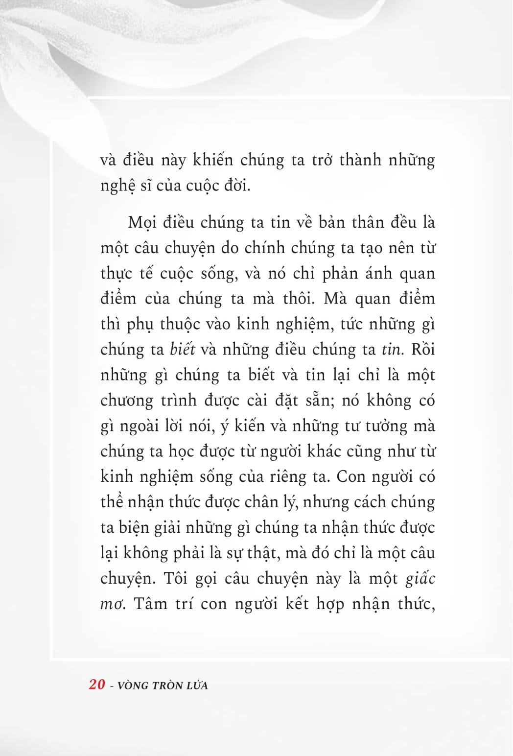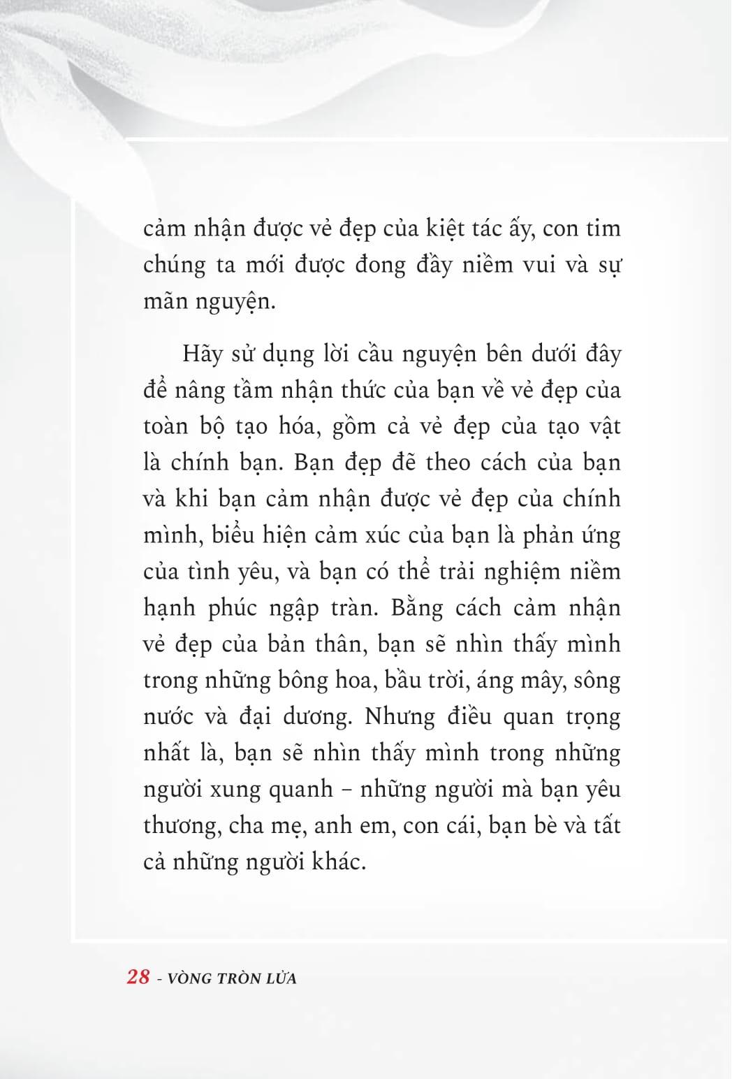 Theo quan điểm của tác giả, lễ “Vòng tròn lửa” kỷ niệm ngày quan trọng nhất trong cuộc đời của chúng ta: ngày mà chúng ta hòa vào ngọn lửa của tinh thần, và trở về với thần tính của chính m.ình. Đây là ngày mà chúng ta phục hồi nhận thức về con người thật của chúng ta và đưa ra lựa chọn để sống trong sự hiệp thông với Đấng Sáng thế mà chúng ta gọi là “Sự sống” hoặc “Chúa”. Kể từ ngày đó trở đi, chúng ta sống với tình yêu vô điều kiện trong trái tim m.ình dành cho chính m.ình, cho cuộc sống, cho mọi thứ của tạo vật.