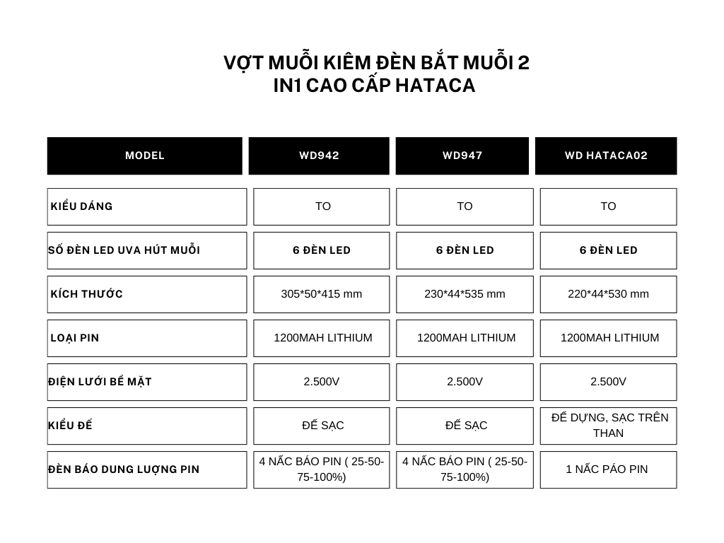 Vợt muỗi Hataca 2 trong 1 cao cấp, vừa là vợt muỗi vừa là đèn diệt muỗi thu hút muỗi đến tự động Trang bị 6 đèn led, là ánh sáng thu hút muỗi đến và diệt muỗi với điện áp diệt muỗi lên đen 2500v. Sản phẩm bao gồm: 1 x Vợt muỗi 1 x Đế sạc 1 x Dây USB