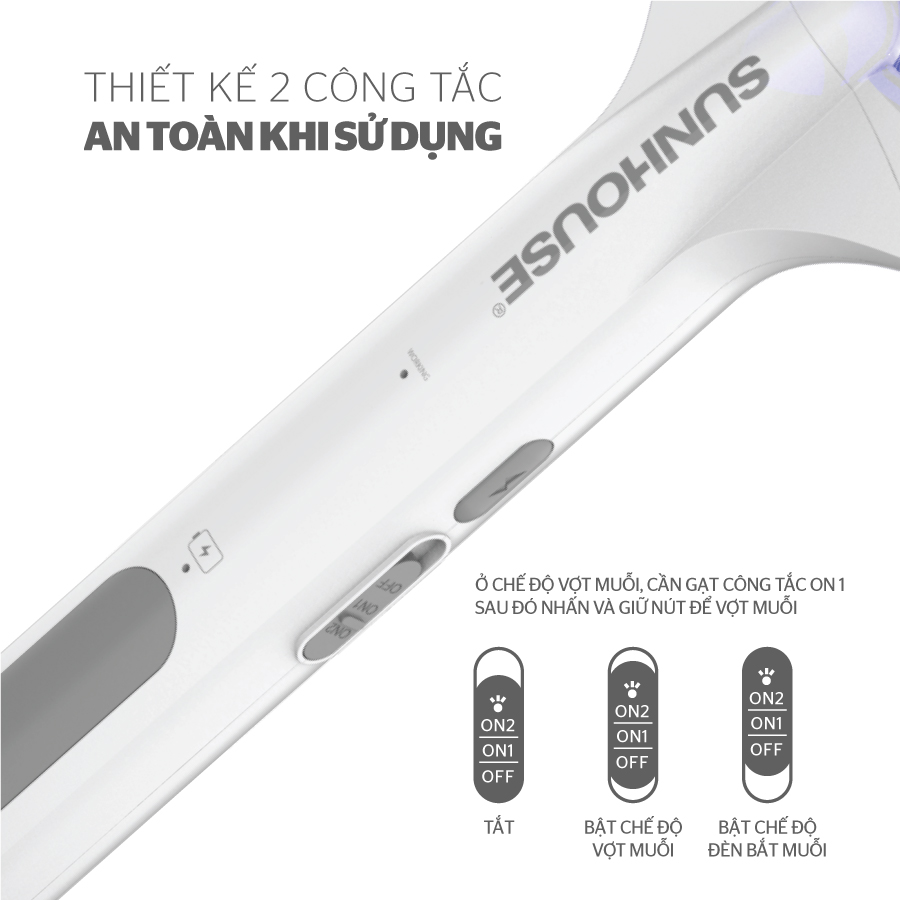Vợt muỗi SUNHOUSE SHE-EECVM11 Đặc điểm nổi bật - 3 lớp lưới giúp tiêu diệt muỗi nhanh chóng - Tích hợp đèn báo sạc tiện dụng - Nhựa ABS an toàn, chịu va đập -