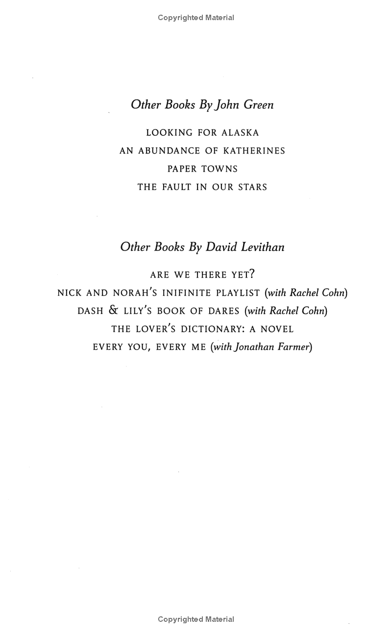 Told in alternating voices from two award-winning authors - John Green (author of The Fault in Our Stars) and David Levithan (author of Boy Meets Boy) - this unique collaborative novel features a double helping of the heart and humour that has won both authors legions of fans.