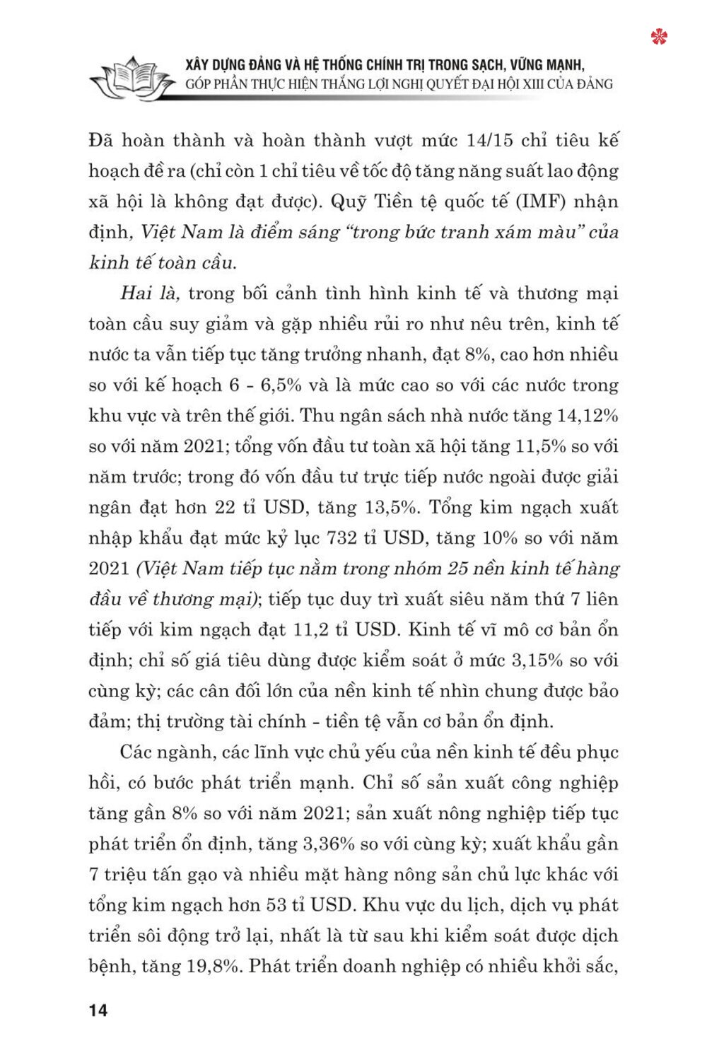 Mua tại TiktokCuốn sách “Xây dựng Đảng và hệ thống chính trị trong sạch, vững mạnh, góp phần thực hiện thắng lợi Nghị quyết Đại hội XIII của Đảng” tuyển chọn các bài phát biểu, bài viết, bài trả lời phỏng vấn, thư, điệ tiêu biểu của đồng chí Tổng Bí thư Nguyễn Phú Trọng trong năm 2023, cho thấy sự chỉ đạo sát sao, tâm huyết của người đứng đầu Đảng ta với các vấn đề quan trọng của đất nước trong năm 2023 - năm bản lề thực hiện Nghị quyết Đại hội XIII của Đảng.