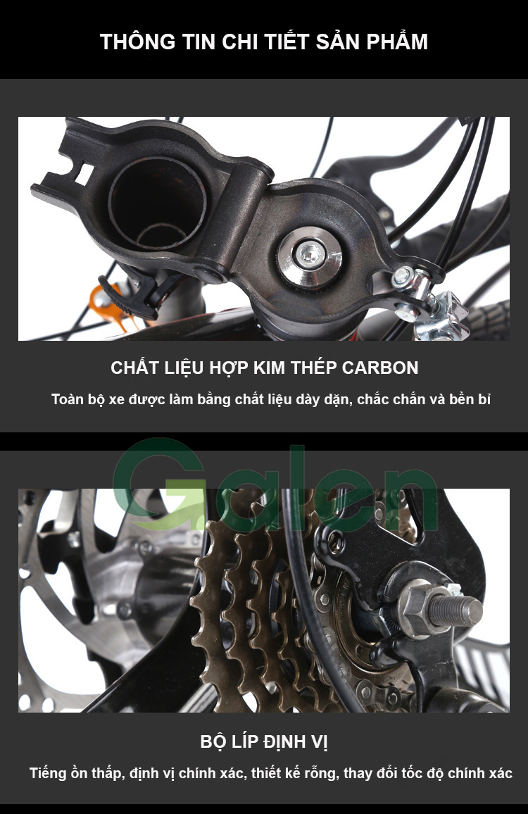 - Xe đạp thể thao địa hình gấp gọn Galen G008 được cấu tạo từ bộ khung ống thép cao cấp, không gỉ, có trọng tải lên tới 16kg nên vô cùng chắc chắn và an toàn cho người sử dụng.