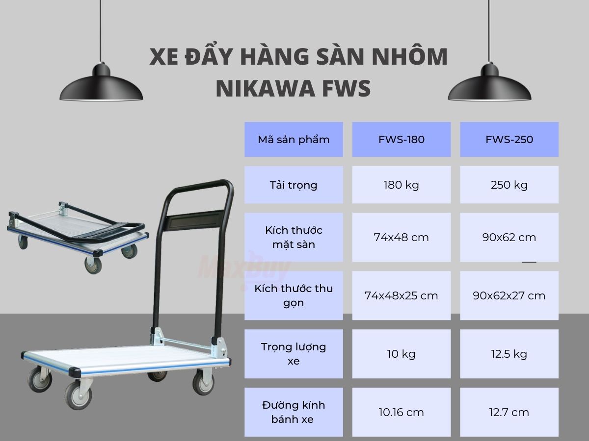 - Xe Đẩy Hàng Nikawa FWS-180 thiết kế sàn bằng nhôm với kích thước 74 x 47 cm, mặt sàn bằng phẳng cứng cáp và tránh bị han gỉ nên có thể xếp hàng hóa lên vận chuyển.