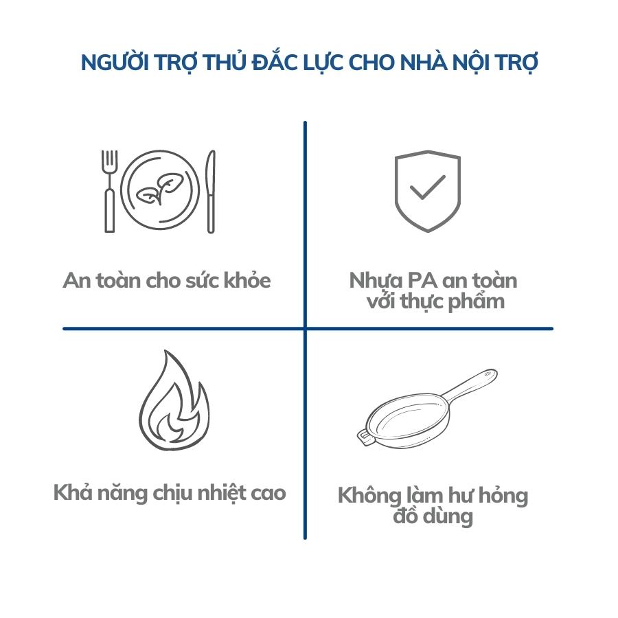 Bộ dụng cụ nhà bếp INOCHI Chất liệu: Nhựa PA cao cấp an toàn cho sức khỏe Kích thước: 145x145x394mm Đặc tính sản phẩm: - Bộ dụng cụ không làm trầy xước lớp chống dính