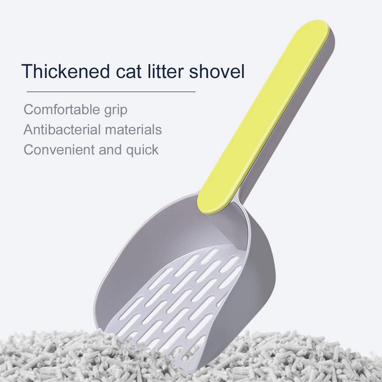 Description:   Filtering: Choose high strength, high toughness product raw-materials, easy to filter out the cat litter. Easy use: The front blade is gradually thickened to make the sand more incised, allowing you to easily