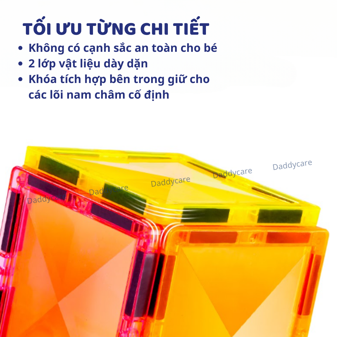 - TỐI ƯU TỪNG CHI TIẾT: Mỗi miếng ghép được đánh nhẵn 360 độ, đảm bảo không có cạnh sắc để bảo vệ bàn tay nhỏ bé của con; 2 lớp vật liệu dày dặn giúp ngăn chặn việc miếng ghép rời ra và nứt vỡ. Nhiều khóa tích hợp bên trong giữ cho các lõi nam châm nằm cố định và không bị rơi ra.