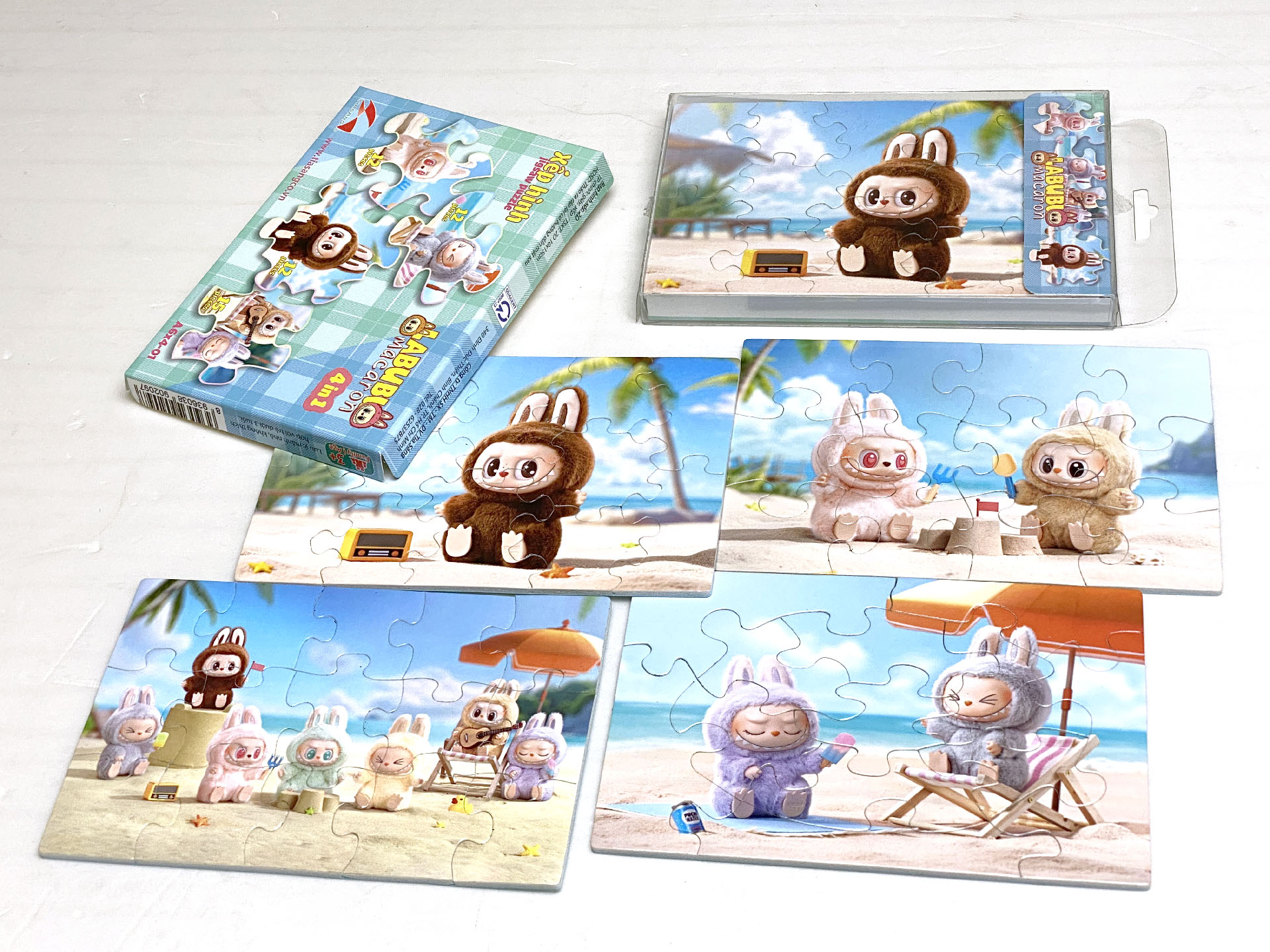 KT tranh: 100x150x3mm KT hộp: 105x155x15mm LABUBU- là một bộ xếp hình riêng dành cho các em nhỏ từ 3 đến 6 tuổi. Có 4 tranh xếp hình trong 1 hộp, mỗi tranh có mảnh