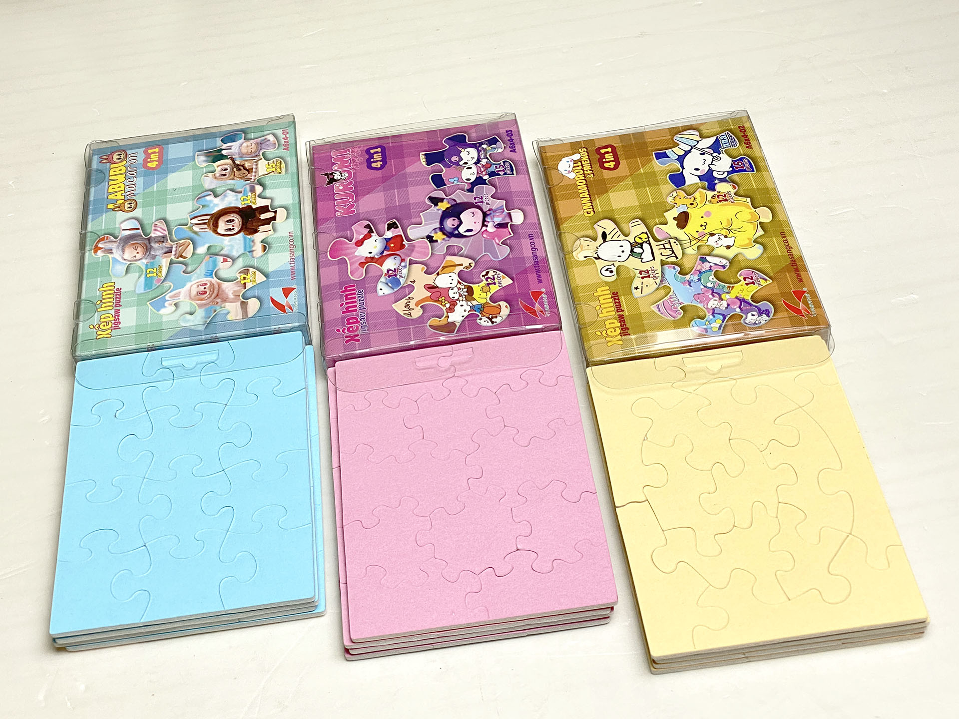 Có 4 tranh xếp hình trong 1 hộp, mỗi tranh có mảnh ghép to, dày, đặc biệt là hình dạng mảnh ghép ngộ nghĩnh và đầy sáng tạo, dễ dàng phân biệt với các tranh còn lại.