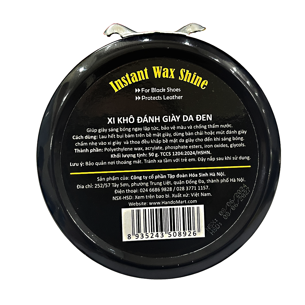 THÔNG TIN SẢN PHẨM Tên SP: Xi khô đánh giày da, đồ da Hando 50g (Đen / Nâu) Thành Phần : Polyethylene wax , acrylate, polysorbate esters , iron oxides , glycols Trọng lượng : 50g