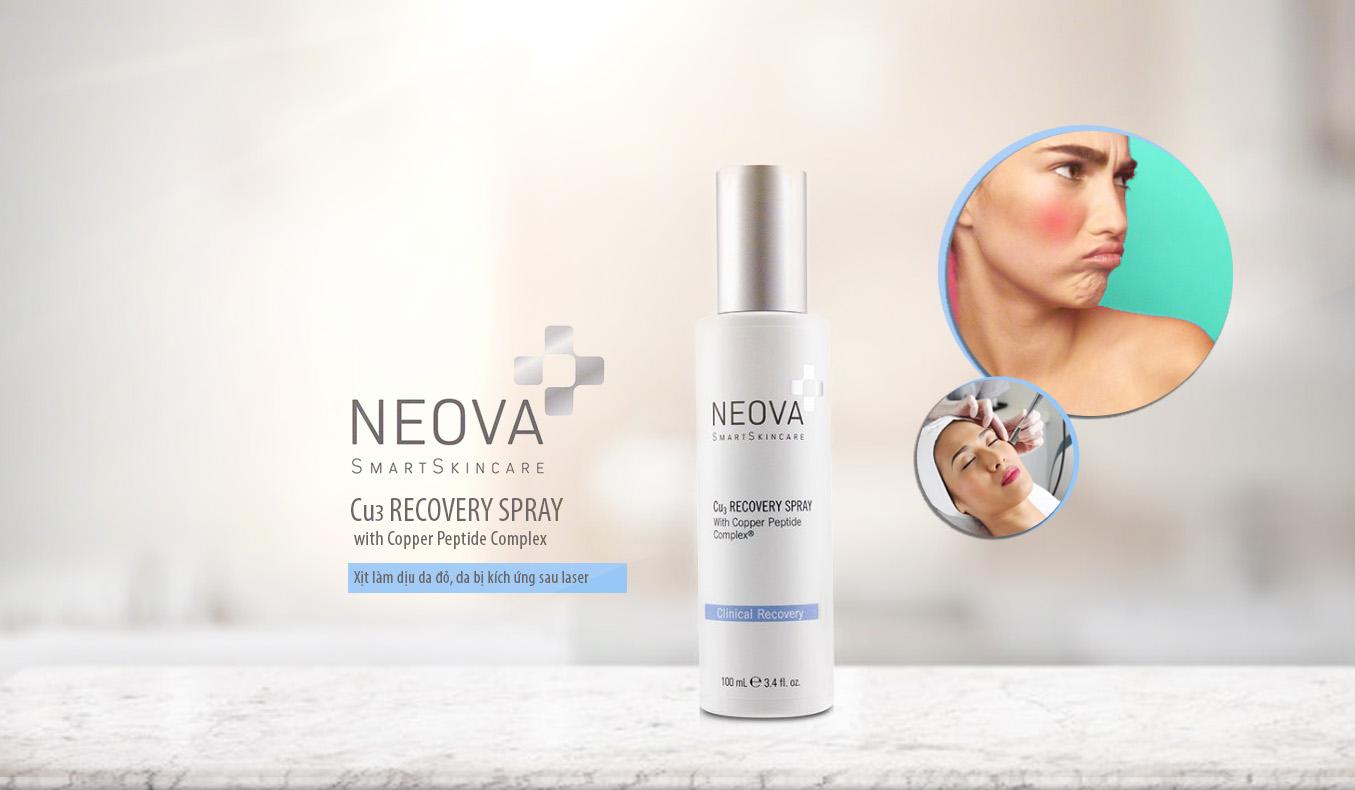 Neova Cu3 Recovery Spray làm dịu da khi bị đỏ, kích ứng sau laser, thủ thuật khác. Kết quả mang đến làn da khoẻ mạnh, rạng ngời và tươi tắn hơn. Neova Cu3 Recovery Spray làm dịu da tức thì.  Neova Cu3 Recovery Spray “hồi sinh” cho làn da rạng ngời Hiện nay, rất nhiều chị em thực hiện các phương pháp peel da, laser…để ngừa mụn, lão hoá, nám, tàn nhang…Tuy nhiên, sau đó làn da sẽ trở nên rất nhạy cảm. Chính vì vậy, cần có một chế độ chăm sóc da trong giai đoạn này vô cùng đặc biệt. Neova Cu3 Recovery Spray được biết đến là xịt làm dịu và phục hồi da được yêu thích nhất hiện nay. Neova Cu3 Recovery Spray là sản phẩm của . Nếu bạn là tín đồ của phái đẹp hẳn không còn xa lạ với cái tên Neova này. Neova là thương hiệu mỹ phẩm cao cấp được thành lập từ năm 1986. Thuộc Tập đoàn dược mỹ phẩm Photomedex Hoa Kỳ, Neova mang đến những sản phẩm chăm sóc da toàn diện cho người dùng. Mỹ phẩm Neova thích hợp cho mọi làn da, mọi sắc tộc. Những sản phẩm của hãng đảm bảo cung cấp bộ sản phẩm chăm sóc da toàn diện: sữa rửa mặt, toner, dưỡng ẩm, chống nắng, chống và ngừa lão hoá, phục hồi da, dưỡng trắng…Tất cả mỹ phẩm Neova đều sử dụng thành phần chiết xuất chính từ thiên nhiên. Điều này giải thích vì sao sản phẩm đảm bảo an toàn tuyệt đối cho người dùng. Tác dụng nổi bật của Neova Cu3 Recovery Spray Quay trở lại với Neova Cu3 Recovery Spray. Đây cũng là một trong những sản phẩm tiêu biểu của hãng. Những lợi ích thực tế của xịt phục hồi da này đã được người dùng khẳng định: