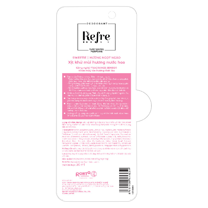 - Xịt khử mùi dưỡng trắng hương nước hoa Refre giúp dưỡng trắng vùng da dưới cánh tay nhờ chiết xuất Aloe Vera (Nha Đam) và Licorice (Cam Thảo).