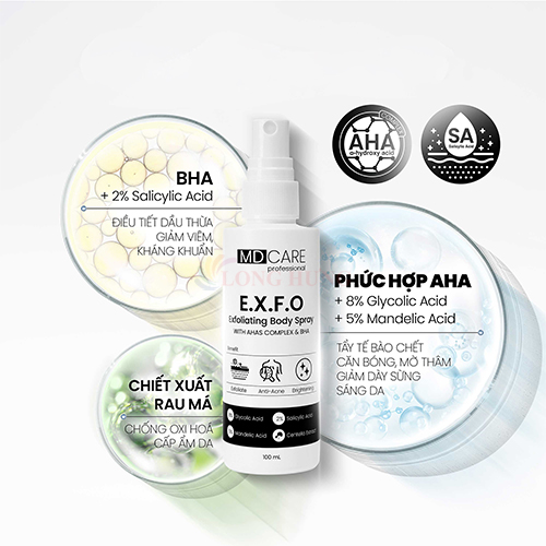 Xịt tẩy tế bào chết toàn thân MD CARE Exfoliating Body Spray là giải pháp làm sạch da hiệu quả. Sản phẩm dạng xịt tiện lợi, giúp loại bỏ tế bào chết và bã nhờn,