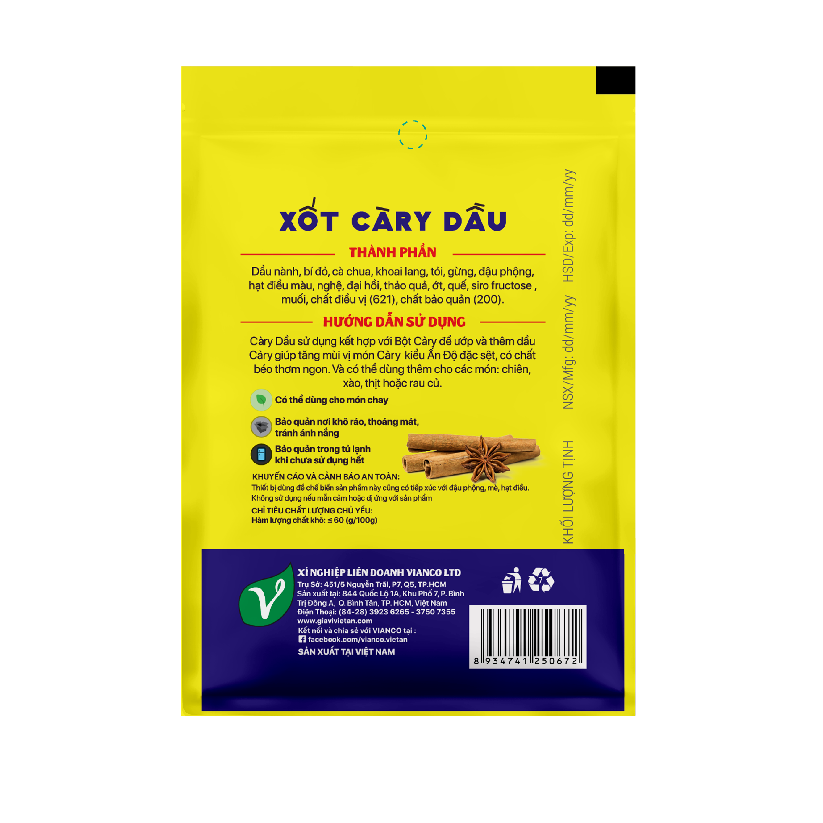 - Thành Phần: Dầu nành, bí đỏ, cà chua, khoai lang, tỏi, gừng, đậu phộng, hạt điều màu, nghệ, đại hồi, thảo quả, ớt, quế, siro fructose, muối, chất điều vị (621), chất bảo quản (200). KHÔNG CHỨA BỘT MÀU TỔNG HỢP.