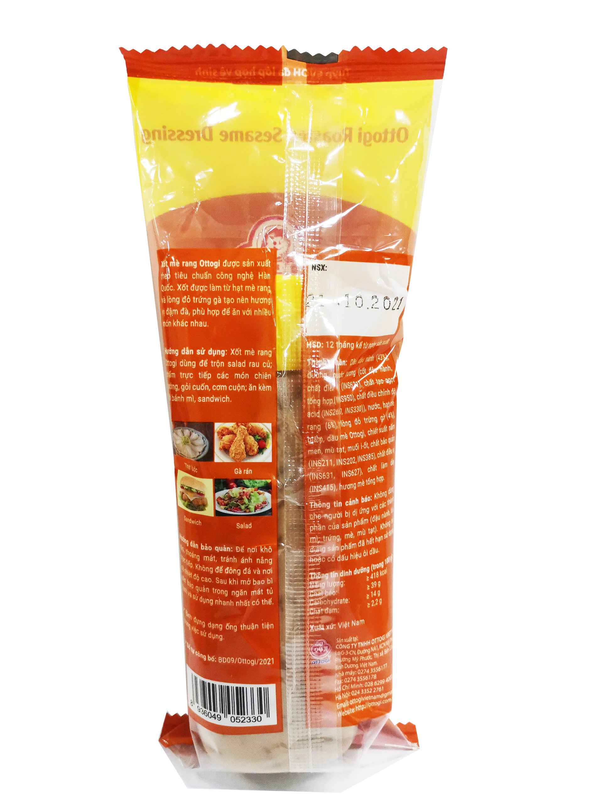 - Thành phần: Dầu đậu nành(43%), đường, nước tương( cốt đậu nành) chất điều vị( INS621), chất tạo ngọt tổng hợp (INS260, INS330)), nước, hạt mè rang( 6%), lòng đỏ trứng gà ( 4%), giấm, dầu mè Ottogi, chất xuất nấm men, mù tạt, muối i-ốt, chất bảo quản INS211, INS202, INS385). HDSD: Xốt mè rang Ottogi dùng để trộn salad rau củ; chấm trực tiếp các món chiên nướng, gỏi cuốn, cơm cuộn, ăn kèm với bánh mì, sandwich. HSD 12 tháng kể từ ngày sản xuất.