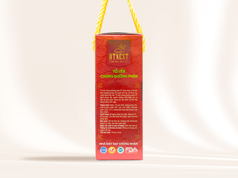 - Yến sào: Hỗ trợ tăng sức đề kháng cho cơ thể, chống lão hóa, ổn định thần kinh, trí nhớ, kích thích tiêu hóa, phục hồi sức khỏe nhanh chóng trong thời gian dưỡng bệnh. Đối tượng sử dụng: thích hợp cho mọi đối tượng đăc biệt trẻ từ 3 tuổi trở lên Sản xuất: Việt Nam Thành phần: Nước, , Yến sào (25%), đường phèn (4%) , chất ổn định (E406), hương liệu dùng cho thực phẩm. Cách dùng: - Lắc nhẹ trước khi uống, ngon hơn khi uống lạnh, tránh đun nóng sản phẩm trước khi sử dụng. - Uống trực tiếp từ lọ. --Uống từ 1 - 2 lọ/ngày. Sản phẩm thích hợp cho người lớn tăng sức đề kháng giúp cơ thể khỏe mạnh, phục hồi sức khỏe cho người bệnh, Không sử dụng sản phẩm khi hết hạn, nên sử dụng một lần sau khi mở nắp.